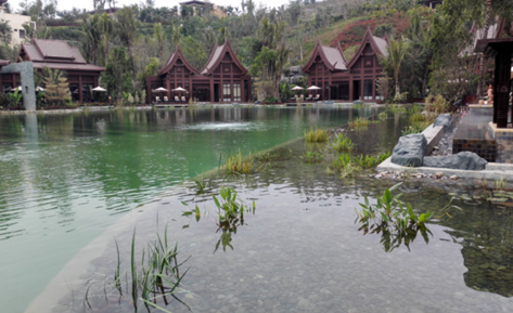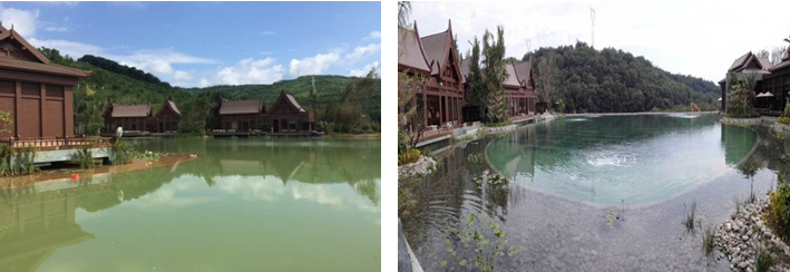 就以萬達(dá)西雙版納國際度假區(qū)來說,承擔(dān)了其酒店群的主樓前場、SPA區(qū)的兩個人工景觀湖水處理的改造項(xiàng)目,水面面積約8000m2、水量30000m3,處理后的水質(zhì)達(dá)到地表水Ⅲ類標(biāo)準(zhǔn),整個方案采用了“生態(tài)治理法+機(jī)械曝氣”的水處理工藝。