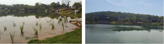 改造前,湖面水體程淡綠色,主要是由于有機(jī)物、氮、磷過多,從而引起水中藻類及浮游生物迅速繁殖;改造后,人工湖經(jīng)改造后再次恢復(fù)了清亮,水質(zhì)清澈見底,一眼望下去,清晰可見湖水底部形態(tài)各異的鵝卵石。