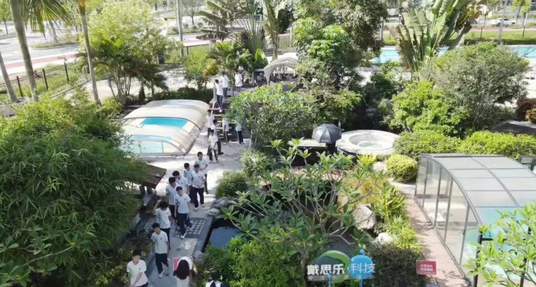 在森薇園,造型各異的泳池設(shè)施瞬間吸引了學(xué)生們的目光。講解員化身“水質(zhì)偵探”,通過(guò)“望、聞、問(wèn)、切”趣味互動(dòng),為大家揭開(kāi)辨別泳池水質(zhì)衛(wèi)生的神秘面紗,深入淺出地講解泳池水處理知識(shí)。