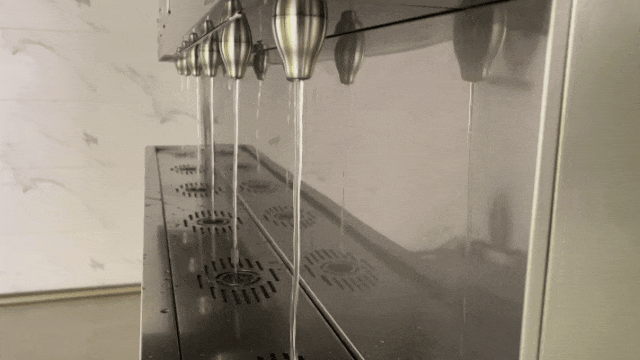 此次校園共配備戴思樂®校園凈飲水設(shè)備8臺,搭載反滲透負(fù)壓勻柔流專利技術(shù),確保出水純凈,水流穩(wěn)定;采用“兩開四溫”可調(diào)模式(開水配“童鎖”功能),每臺設(shè)備設(shè)有6個出水嘴,且均配置紫外消毒功能;同時,接水臺還加裝防濺面板,構(gòu)建安全、健康的接飲水環(huán)境。