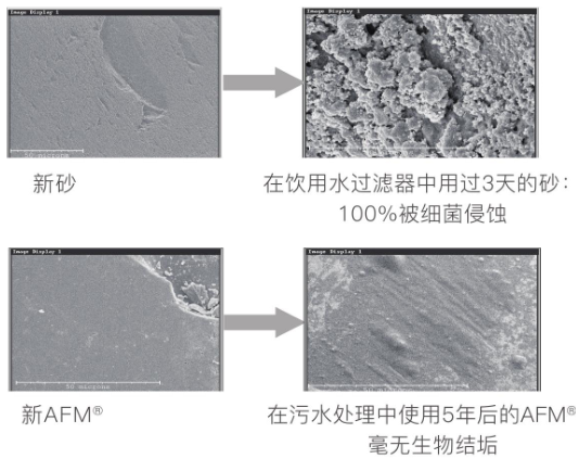 對(duì)大部分“水處理”系統(tǒng)而言,濾床是微生物滋生與繁殖的主要場(chǎng)所,因此解決濾床的微生物孳生與繁殖,是本系統(tǒng)的重要組成部分——AFM,作為一個(gè)蘇格蘭進(jìn)口產(chǎn)品,就是破解這一難題的環(huán)保選擇:用它取代容易滋生細(xì)菌的石英砂,可利用表面自消毒能力、讓細(xì)菌失去賴以生存的場(chǎng)所與食物,從而大大減少了整個(gè)水處理系統(tǒng)的微生物、減少了對(duì)消毒劑的依賴。