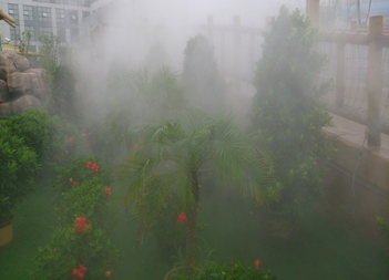 一片薄霧籠罩著鳥(niǎo)語(yǔ)花香的園區(qū)景觀(guān)